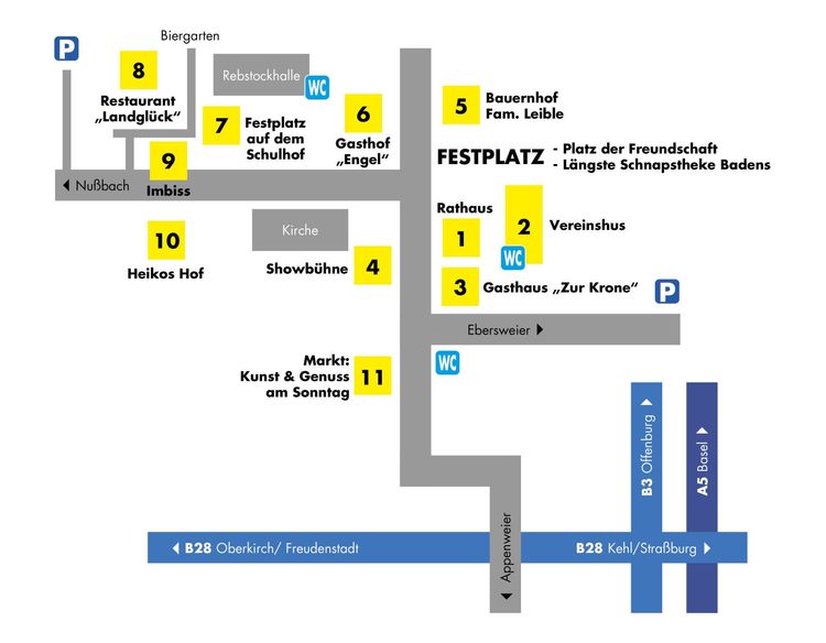 - Längste Schnapstheke Badens, Weinlauben mit Wein-Spezialitäten, Bewirtung durch die örtlichen Vereine